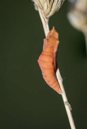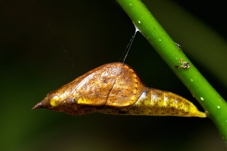 Butterfly pupa hanging on a stick, ready to hatch
