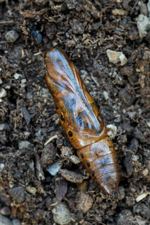 Red cocoon of a butterfly on the ground. The chrysalis of a moth close up.
