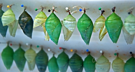 Stock image has twos rows of various shades of green butterfly chrysalis or pupa stage of insect development. They are individually hanging from a pin.