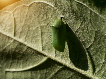 Butterfly pupa on a green leaf, closeup of photo