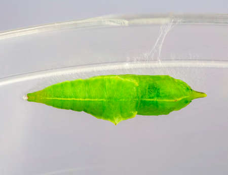 View of the green chrysalis of the Cabbage White Butterfly life cycle