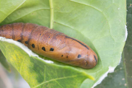 Butterfly larva on a green leaf in the garden.