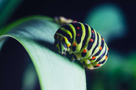 The caterpillar of the Papilio machaon butterfly crawling on green leaf in summer garden