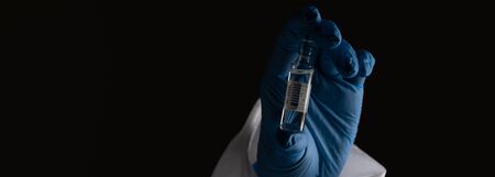 syringe coronavirus vaccine on dark background. Coronavirus treatment concept, vaccine injection.