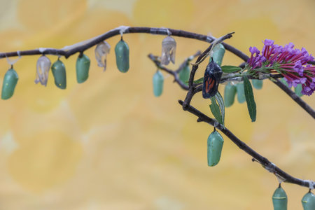 View of transmission of tropical butterfly hatching, row of cocoons in different colors.