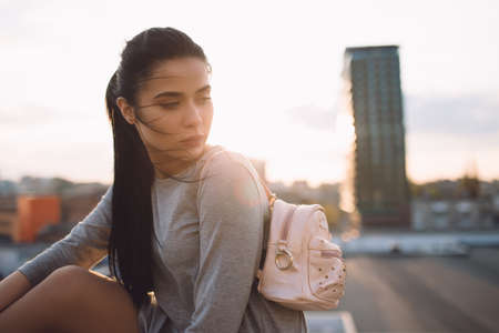 Stylish young woman sitting on roof and relaxation, evening city background