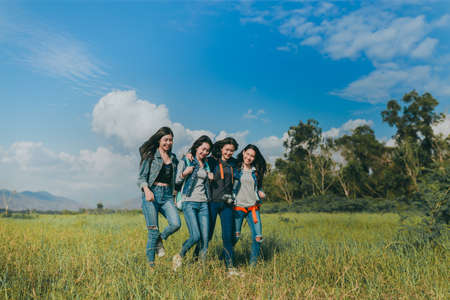 Group of Young Asian women walking enjoy travel trekking to destination in vacation time for go to camping.