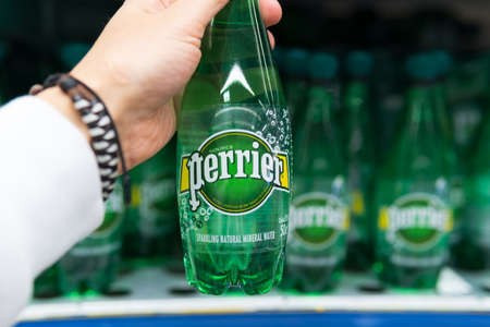 Tyumen, Russia-april 21, 2021: mineral water bottles Perrier. French brand of premium mineral water. Selling in the hypermarket