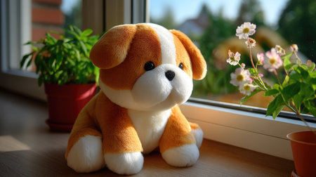 A charming plush dog toy rests on a windowsill surrounded by lively plants and delicate flowers, radiating warmth and coziness in a bright indoor setting.