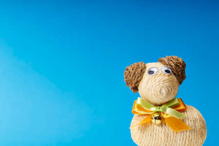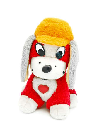 Fluffy black and white dog on a white background. Fluffy toy in the form of a dog.
