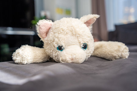 Worn white plush cat toy lying on a couch. Beloved childhood item that brings emotional comfort, personal meaning, and a sense of security over the years. High quality photo