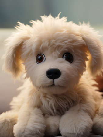AI Generated. Fluffy grey and white stuffed puppy toy on a light background