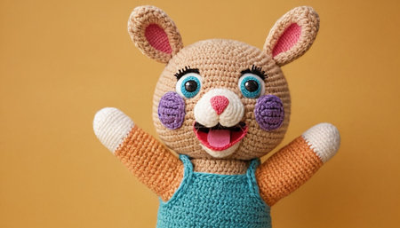 A charming plush toy puppy sits on a vibrant quilt, showcasing a cozy indoor space filled with warm colors and natural light, perfect for playtime.