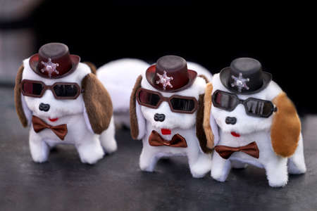 Funny stuffed toy dogs sheriffs in hats and sunglasses. Selective focus.