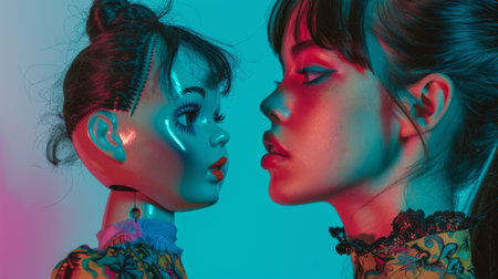 Intimate Gaze Between Young Woman and Doll in Vibrant Neon Lights