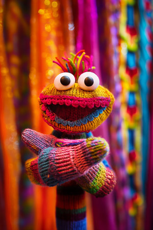 A colorful knitted stuffed animal with a big mouth and eyes, AI