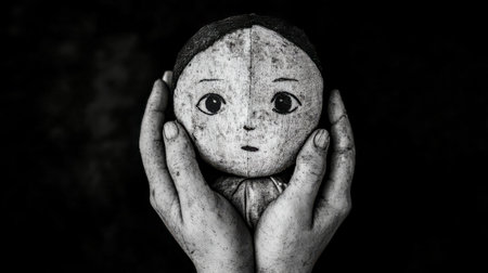 Dirty hands holding old doll in black and white, poverty concept
