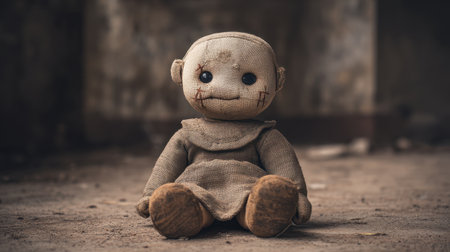 A vintage rag doll with a stitched mouth and worn features, sitting alone on a dusty floor, surrounded by the remnants of an abandoned space, invoking nostalgia.