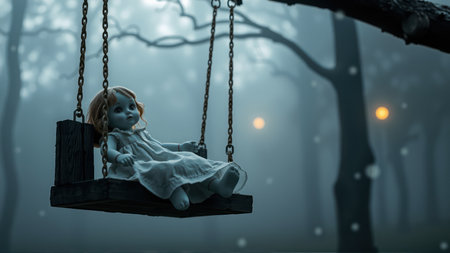 A spooky doll sitting on a swing in a foggy forest at dusk, eerie and haunting. AI generation