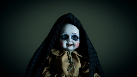 Vintage bisque doll with eerie features, draped in a black hood against a dark background. ideal for capturing chilling aesthetics in horror-themed designs or Halloween decorations. AI generation