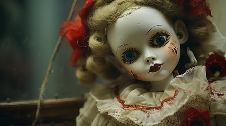 a close-up photo of a paranormal doll, showcasing its eerie features and intricate details. the doll's haunting expression, worn-out appearance, and mysterious aura make it a captivating subject. this close-up shot captures the doll's unsettling presence, revealing its supernatural essence and adding to the intrigue surrounding it. ai generated