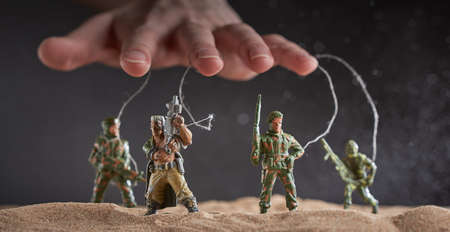 Hand closeup pulling strings, manipulating, controlling. Authority concept. Banner with copy space for text.