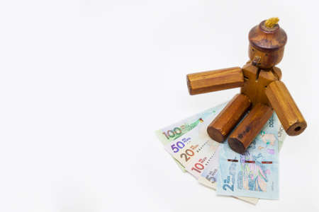 Figure of wooden man with sad expression holds 100 dollar bills with paper clip on yellow background.