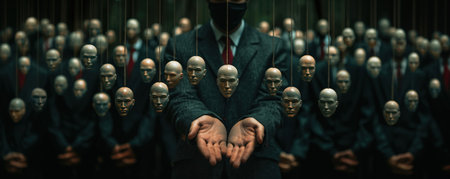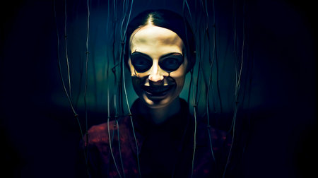 A puppet master figure stands confidently, dressed in a tailored suit with a sly grin. The dim lighting enhances the unsettling atmosphere as strings dangle from above, evoking a sense of control.