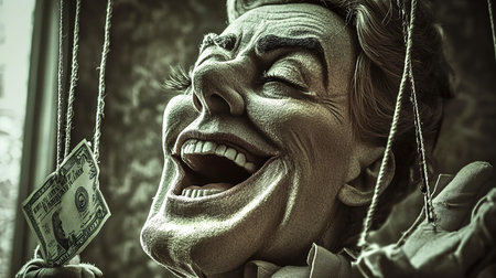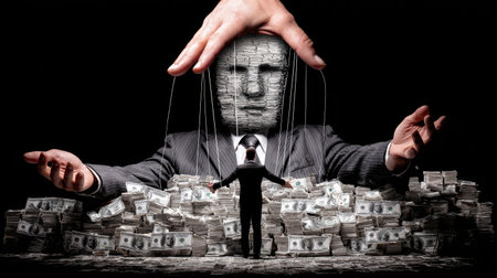 A surreal artistic composition depicts a large hand manipulating a puppet-like figure above stacks of money. The visual style features stark contrasts between light and shadow on a dark background. This image could be used for financial, political, or social commentary illustrations.