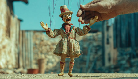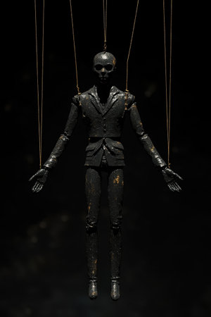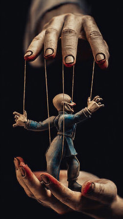 Narrative of control depicted through a puppet on strings held by a detailed hand against a dark background