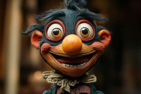 A puppet character with vibrant colors and oversized features showcases a cheerful expression. Set against a softly lit background, the cozy atmosphere enhances the whimsical appeal of this delightful figure, inviting smiles and admiration.