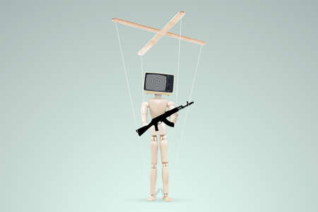 The hand with the pistol is aimed at the puppet with raised arms. Crime, extortion
