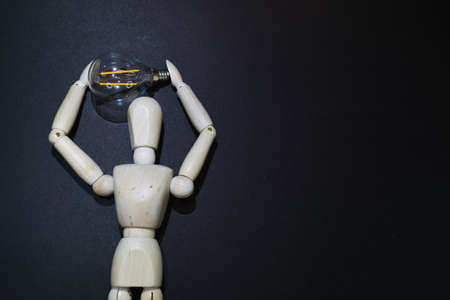 Mannequin Wood Figure carrying an incandescent light bulb. New idea concept. black background