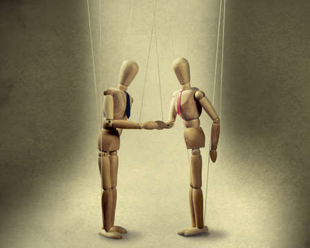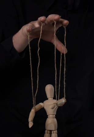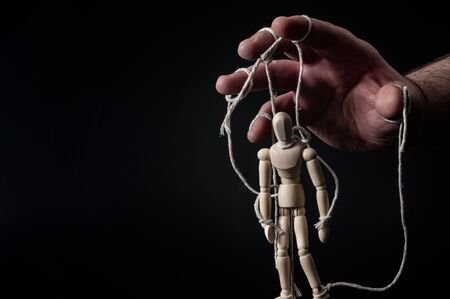 Boss hand manipulating and controling wood marionette. Master of puppet concept.