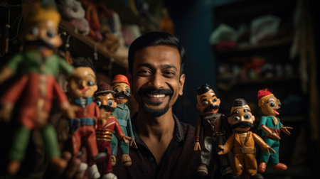 The picture of puppeteer is selling marionette that has been filled in the background of shop, the puppeteer require skill like audience engagement, creativity, puppetry expertise, experience. AIG43.