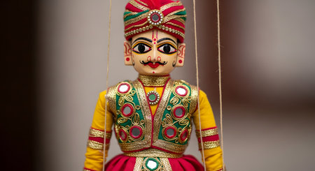 A close-up portrait of a traditional Indian Kathputli string puppet from Rajasthan. The wooden puppet is brightly painted and dressed in a colorful costume, including a turban and an ornate vest decorated with mirrors and embroidery. This image captures a piece of India's rich cultural heritage and folk art.