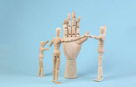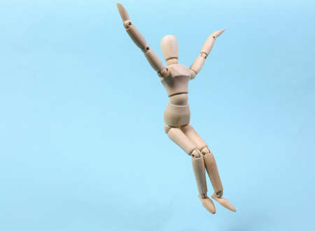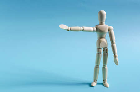 The figure of a wooden man with an outstretched arm on a blue background. The figure of a wooden man on a colored background of copy space