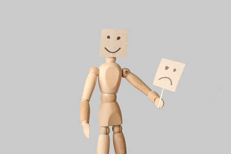 Wooden mannequin lies in a protective position on gray background. loneliness, violence, vulnerability, depression disorder concept. copy space, hard light.