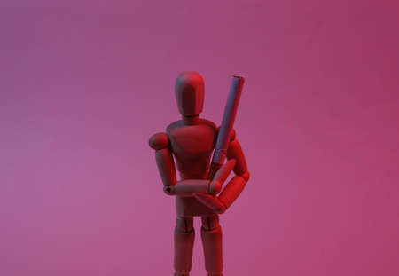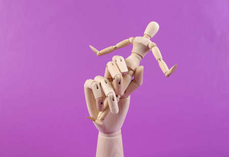 Wooden hand holding wooden puppet in pink blue gradient neon light