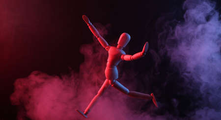 Dynamic pose of a wood artist's model mannequin, headed towards the light. Shot over flat dark grey background.
