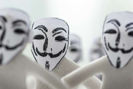 The concept of extortion, blackmail. Man in a hoodie and a puppet.