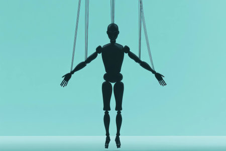 Black puppet figure suspended on strings against a turquoise background, representing control, art, and creativity with smooth lines and minimalistic style