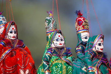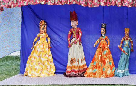 Rajasthan tribal puppet show by local tribal performers using hand crafted vividly colorful string dolls to portray historical characters, copy pace and crop margins
