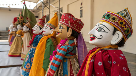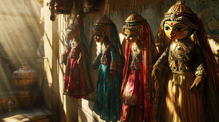 Vibrant wooden puppets of an ancient Indian puppet theater, depicting mythological stories and legends