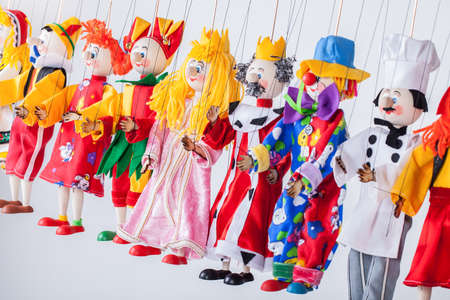 View of street puppet show theatre, with puppeteer puppet master pulling the strings over marionette different dolls