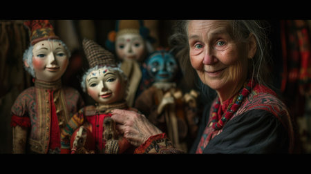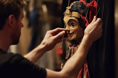 A highly skilled artisan meticulously strings a beautifully crafted puppet for an enchanting theatrical performance. Generative AI