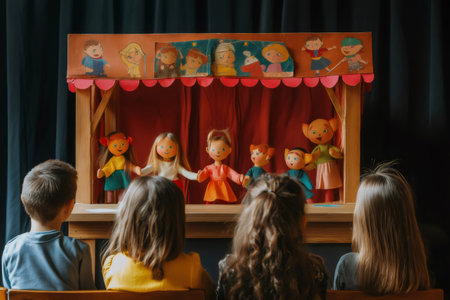 Engaged children watch a lively puppet show featuring a lineup of beautifully crafted puppets