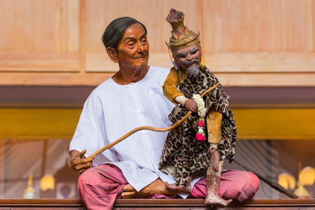 Thai professional puppeteer or Puppet master manipulate playing acting ancient puppets toy or antique marionette on stage for show in night festival event at SamYan on May 22, 2011 in Bangkok Thailand