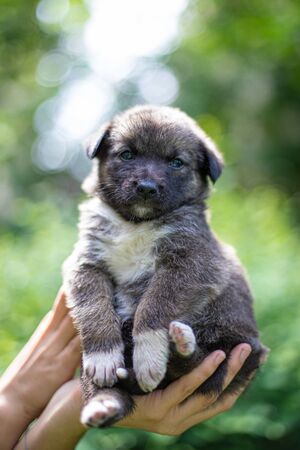 Portrait young dog playing in the meadow. Little Puppy of the Caucasian Sheepdog