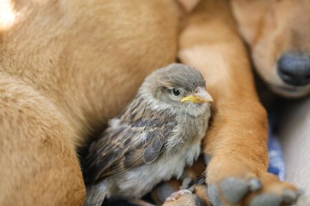 Sparrow is sitting near the dog. dog and bird. friendship between animals.